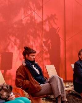 „After All. A Requiem of the Fossil Age“ is an audio performance for public space. Visitors gather as a group, are given headphones, and walk together across an abandoned works site to a semi-open pink pavilion. A fire is lit in their midst as found objects from their walk, guided by artist Paula Erstmann, are burned and made into tea and food. The spoken text over headphones is complemented by a live musical performance by trombonist Moritz Anthes and sound artist Thomas Meckel.