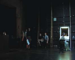 In semi-darkness, people scurry through the picture, moving almost silently, hardly speaking. Their costumes give us a notion – which is then clarified by the announcement that the performance is about to begin and everyone should get in place: We are at the theatre. But our attention is not focused on the stage, we are looking backstage where actors and actresses are waiting for the moment of their appearance, they gather and then disappear from the camera’s field of view. That their appearance on stage is also the moment they leave the camera’s field of view makes it an exit. Jakob Engel turns the stage around, he makes what is behind to what is in front, thus raising the question where the theatre actually begins. The about-face also applies to the acoustic backdrop: It isn’t the spoken word that stands out, it is the background noise, like rustling or whispering, as if at the moment of most intense expectancy, the senses are particularly honed for what is otherwise incidental.
